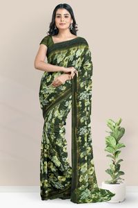 Chiffon Georgette Floral Print Dark Green Saree