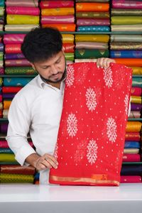 Chiffon Gold Zari Brocade Border With Bathik Print Red Saree