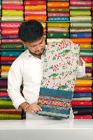 Cotton And Silk Birds Print Ikkath Printed Border Ash With Peacock Blue Saree