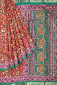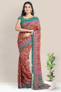 Cotton And Silk Floral Kalamkari Print Maroon With Green Saree