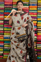 Cotton Silk Leaf Design Grey And Yellow With Black Saree
