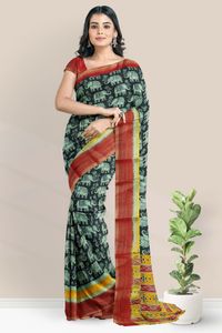 Cotton Silk Mix Kalamkari Print Black With Green Mix And Maroon Saree