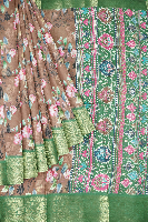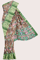 Crepe Silk Floral Digital Printed With Zari Lines Brown Mix With Green Saree