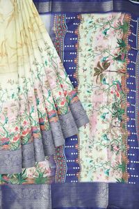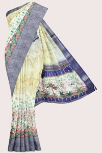 Crepe Silk Floral Digital Printed With Zari Lines Light Leamon Yellow With Blue Saree