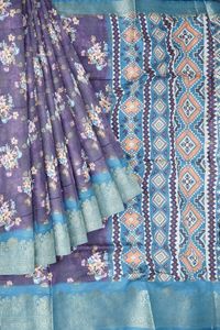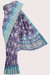 Crepe Silk Floral Digital Printed With Zari Lines PurpleWith Light Blue Saree