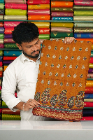 Crushed Maheswari Silk Floral Digital Print Dark Mustard Yellow With Maroon Saree