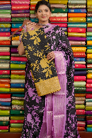 Dola Silk Zari Lines And Printed Black With Gandam Yellow Saree