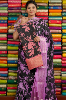 Dola Silk Zari Lines And Printed Black With Peach Saree