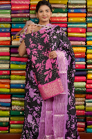 Dola Silk Zari Lines And Printed Black With Pink Saree
