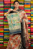 Fancy Silk Digital Print Beige With Peacock Blue Saree