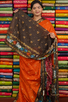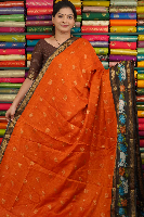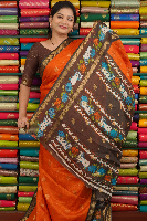 Fancy Silk Gold Zari Butti And Printed Rust Orange With Chocolate Brown Saree