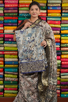 Fancy Silk Kanchi Border And Printed Gray With Navy Blue Saree