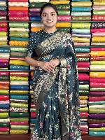 Fancy Silk Print With Zari Border Peacock Green Saree