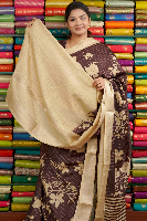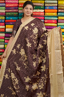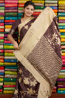 Fancy Silk Print With Zari Checks Brown With Cream Saree