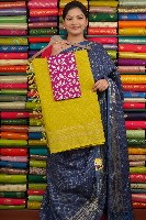 Gadi Silk Gold Zari Checks And Butti Lemon Yellow With Magenta Pink Saree