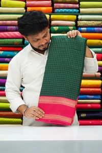 Georgette Checks Pattern Gap Border Dark Green With Pink Saree