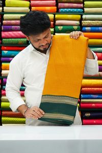 Georgette Checks Pattern Gap Border Dark Mustard Yellow With Green Saree