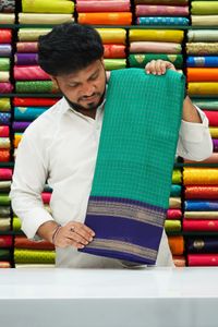 Georgette Checks Pattern Gap Border Rama Green With Dark Navy Blue Saree