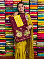 Georgette Crepe Checks And Digital Print Wine With Lemon Yellow Saree
