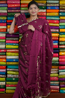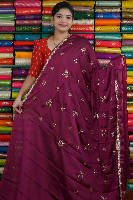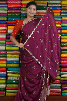 Georgette Crepe Scallop Border And Work Wine Saree