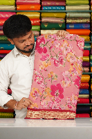 Georgette Floral Print Brocade Border Dark Peach Pink With Magenta Pink Saree
