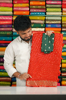 Georgette Gold Zari Weaving Strips Dark Orange With Green Saree
