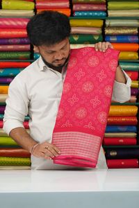 Georgette Zari Brocade Border And Printed Pattern Bright Pink Saree