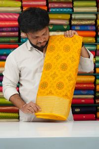 Georgette Zari Brocade Border And Printed Pattern Mango Yellow Saree