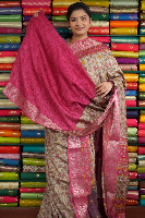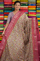 Ikkath Silk Zari Borders Cream With Dark Pink Saree