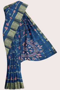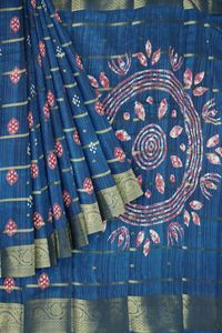 Jute Silk Bandini Print And Flower Butti Pecock Blue Saree