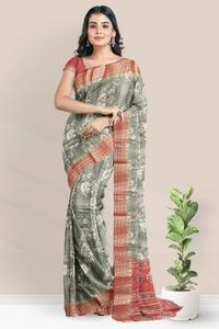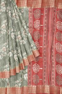Jute Silk Floral Print Paachi Green And Maroon Saree