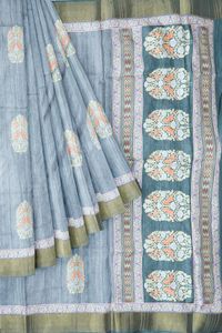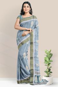 Jute With Bhagalpuri Silk Mix Printed Ash Saree