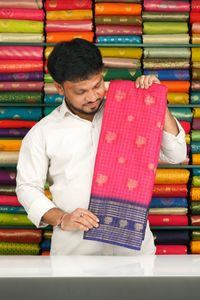 JuteTussar Silk Checks Peacock Rudraksha Butti Dark Pink With Navy Blue Saree