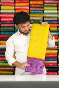 JuteTussar Silk Checks Peacock Rudraksha Butti Golden Yellow With Purple Saree
