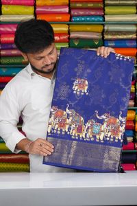 Kalanjali Silk Full Jal Ikkath Print Elephant Design Dark Navy Blue Saree