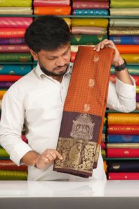 Kanchi Pattu Checks With Peacock Butti Rust Orange With Chocolate Saree