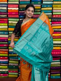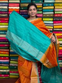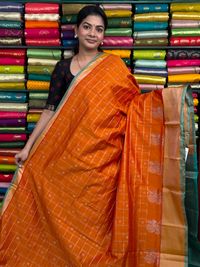 Kollam Pattu Checks And Butti Orange With Sea Green Saree