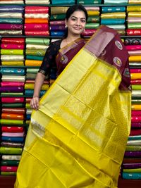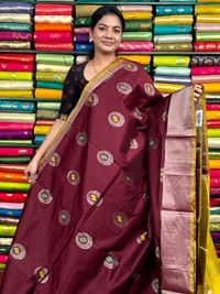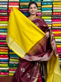 Kollam Pattu Zari Butti Brown With Lemon Yellow Saree