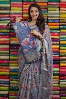 Kora Silk Floral Digital Print Teal Blue Saree