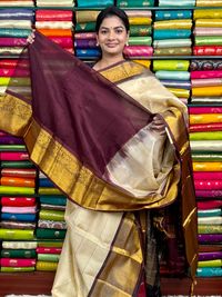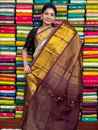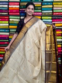 Kuppadam Pattu Checks And Butti Cream With Brown Saree