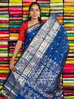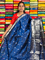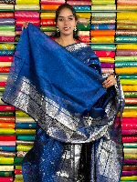 Kuppadam Pattu Gold Zari Butti And Vertical Lines Dark Peacock Blue Saree