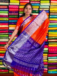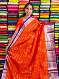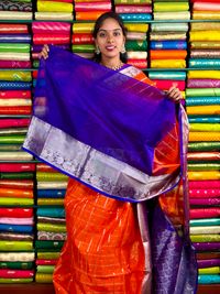 Kuppadam Pattu Gold Zari Checks And Butti Orange With Purple Saree