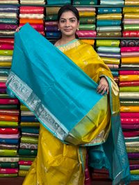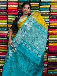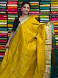 Kuppadam Pattu Zari Butti Yellow With Sea Blue Saree