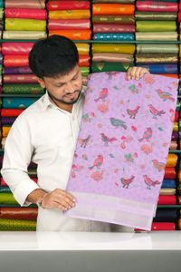 Lenin Jute Silk Floral Birds Design Silver Zari Gap Border Lavender Saree