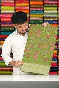 Lenin Jute Silk Floral Birds Design Silver Zari Gap Border Mehandi Green Saree