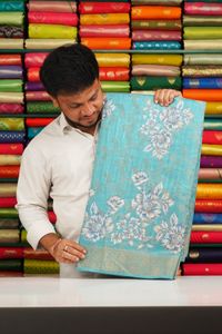 Lenin Silk Full Jal Floral Digital Print Sea Blue Saree