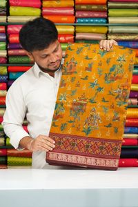 Lenin Silk Kalamkari Print Dark Mustard Yellow With Maroon Saree