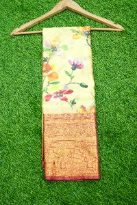Light Weight Printed Pattu Light Yellow And BrickRed Saree