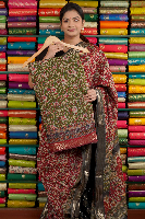 Maheswari Crushed Silk Zari Border Floral Design Mehandi Green With Maroon Saree