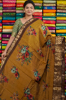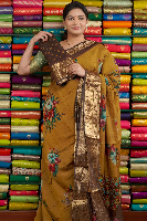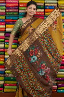 Maheswari Silk Floral Design Mustard Yellow With Brown Saree
